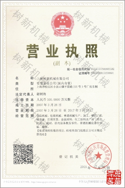 - 上海樹新機器無限公司于2007年正式于工商辦理局注冊建立,并獲批普通征稅人資歷, 2010年也順遂注冊了牌號:樹新機器.相干天資證件以下...